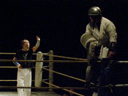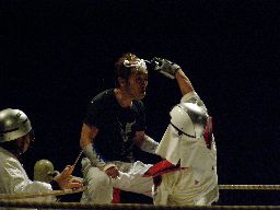試合前にこの試合が押忍闘夢ルールで行われることが発表。まず326が入場。「こんばんは、326です。いよいよ完成しました。国士舘大学のロボット工学の粋を集めたメカ小笠原!」小笠原先生入場。メカというよりおしゃれな消防士だ(右写真)。小笠原「326、よくやった!これで俺は心置きなくレフェリーに徹することができる!」