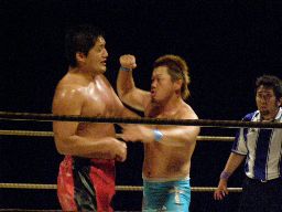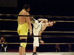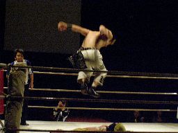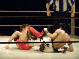 柴田ドラゴン狙う、isamiブロック。柴田ジャーマン狙う、isami回転して着地すると勇み脚(右写真)、柴田倒れない。isamiハイキック、柴田ダウン。isamiカバー、カウント2。