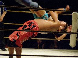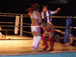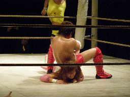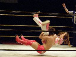 逆エビで決めようとするが(右写真)isamiカット。田村は背中の腰にエルボー、ストンピング。カバー、カウント2。柴田にタッチ。