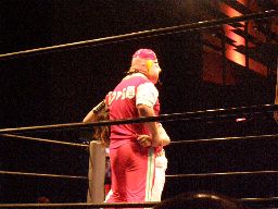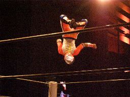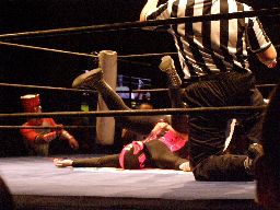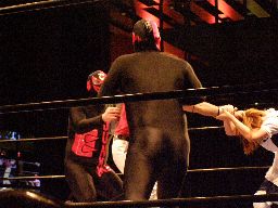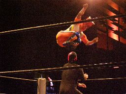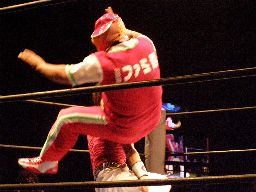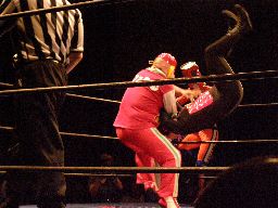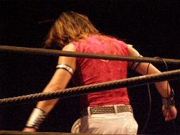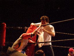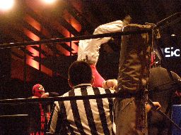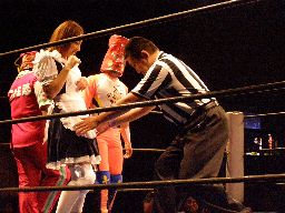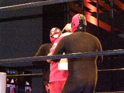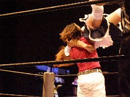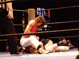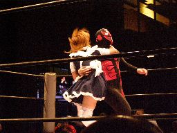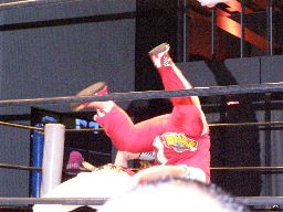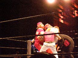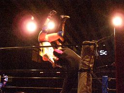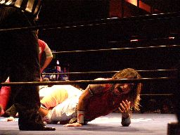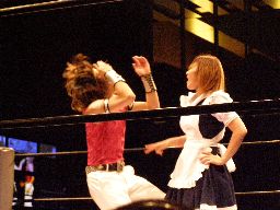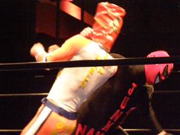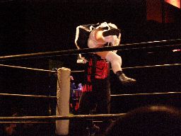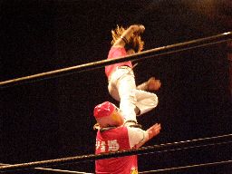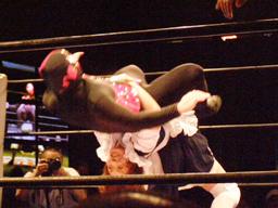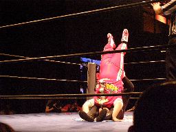 ジャンクマンアップルに長滞空時間ブレーンバスター、コーナーに振る、アップルスイングDDTに切り返す(左写真)。アップルさらにドロップキック、Rionカット。Rionはアップルを場外に出す。10分経過。