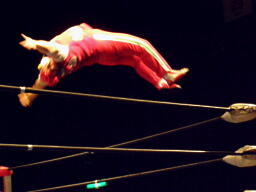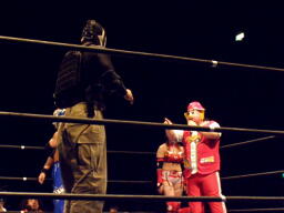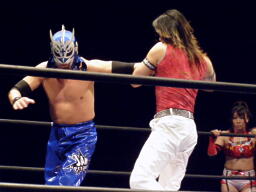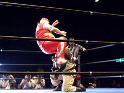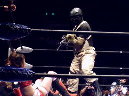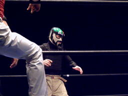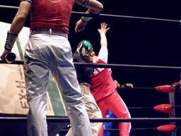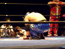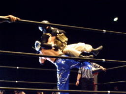 しかしその見かけによらず蛇男は素早い動きで菊タローを翻弄、トラースキック、ハイキックでヒザを着かせるとエプロンに出てスワンダイブチョップ(右写真)。蛇男がコーナーに上る。