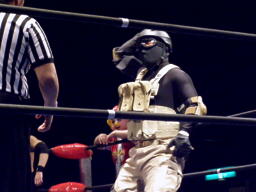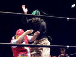 ようやくリングに到達したジョニーが菊タローに伝言を伝える(左写真)。菊タローがタッグパートナーの2人に耳打ち。