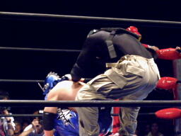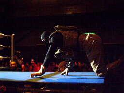PMCはグラビア雑誌をリング上に置いて隠れる。K-ness.つい見てしまう(左写真)。