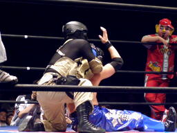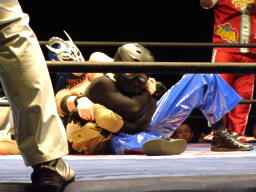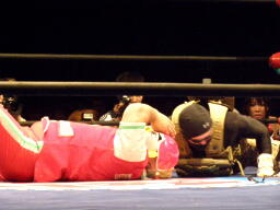 突然出てきてスリーパー(左写真)。菊タローはK-ness.にタッチ。蛇男もPMCにタッチ。