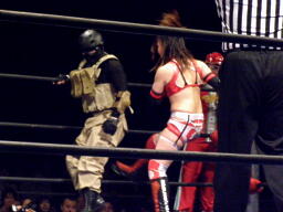 PMCがボディスラム、サブマシンガンを華名に向ける(右写真)。で、ストンピング。10分経過。