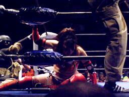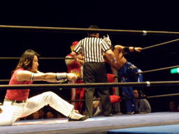 華名ローキック連打(右写真)。PMCはコーナーに押し込んでRionにタッチ。
