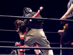 先発はK-ness.とRion。ロックアップ、Rion腕を取る(右写真)、K-ness.切り返す。K-ness.ヘッドロックからフライングメイヤー、Rionヘッドシザーズで返す。K-ness.ガットショット、ヘッドロック、Rionロープに振る、ロープワークからホイップ合戦、ドロップキックは相打ちに。華名とPMCにタッチ。