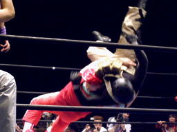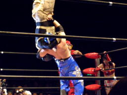パンチの打ち合いから菊タローコーナーに振って串刺しラリアット。菊タローブルドッギングヘッドロックに行くがスッポ抜ける。しかし菊落としからコーナーに上ってムーンサルトプレス(右写真)、蛇男かわす。