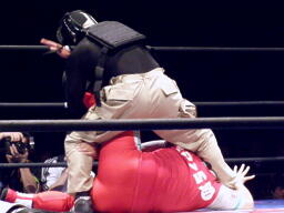 蛇男が華名にコブラツイスト(左写真)。たまに手が蛇界っぽく動く。