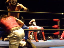 華名ローキック(右写真)。菊タローと蛇男にタッチ。