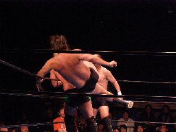 飯伏ロープに飛ぶ、修司カウンタのビッグブーツ。修司チョークスラム(右写真)、飯伏一回転して着地しようとするがトップロープを越えて場外に落ちてしまう。