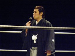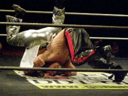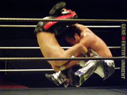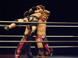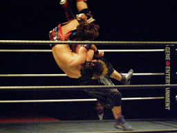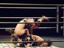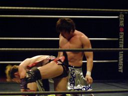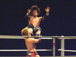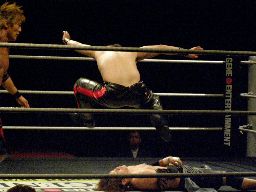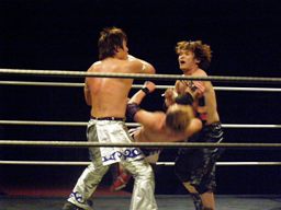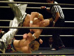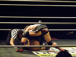 大石が旭のヒザの上からジャンプして正岡を回転エビ固めに固める勢いでカナディアンデストロイヤーみたいにマットに突き刺す(右写真)、カウント3。