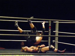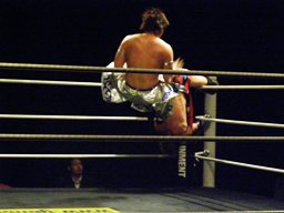 正岡は大石をコーナーに振る、大石切り返す。正岡エプロンに出てハイキック、コーナーに上ってミサイルキック(左写真)、カウント2。