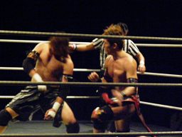 旭スワンダイブフットスタンプ、大石にタッチ。大石カバー、カウント2。大石と正岡パンチの打ち合い(左写真)、大石は旭を呼び込む。