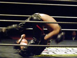 2人でニードロップ連発(右写真)、旭がカバー、カウント2。旭スリーパー、大石にタッチ。大石ストンピング、コーナーに振って串刺しエルボー。