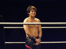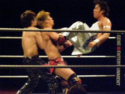 HARASHIMAリバースフランケンシュタイナー(右写真)、再度蒼魔刀に行くが大石がミサイルキックで阻止。