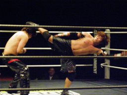 正岡入ってウラカン・ラナ、カウント2。エビ固め、カウント2。狙い済ましたトラースキック(右写真)、大石がカット。