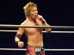 正岡首投げ、ひねりを加えたエルボードロップ(左写真)、カウント2。5分経過。