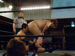 高木がキャプチュードやる(右写真)が松井レフェリーの判定は「塩ちゃんはそんなにちゃんとやらない。」