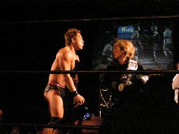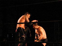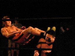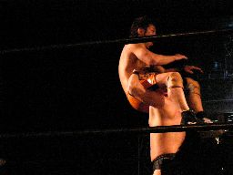 矢郷ロープに飛ぶ、PSJ呪文、矢郷体を沈めてかわすと殺人コブラ(右写真)、リリースしてダブルリストアームサルト、カウント2。