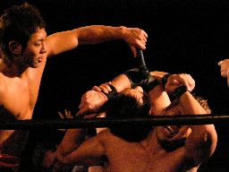 高木テキサスクローズライン、鳥羽の元に行き「鳥羽さん、今がチャンスです、起きてください!」しかし鳥羽は無反応。高梨リーダーとマイケルはダブルのクローズラインからサンドイッチドロップキック(左写真)、高梨リーダーがカバー、カウント2。10分経過。