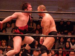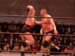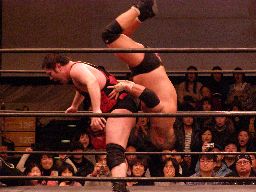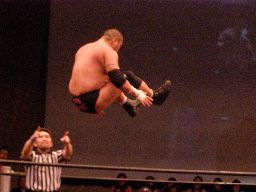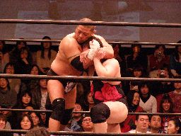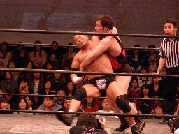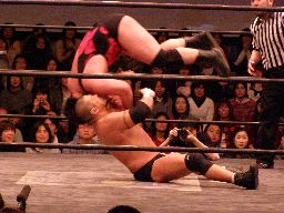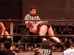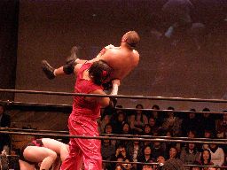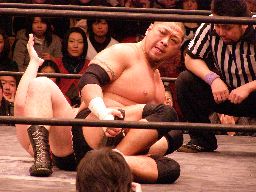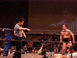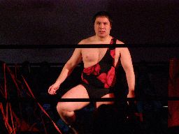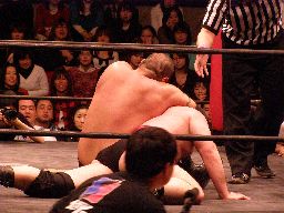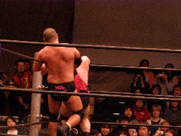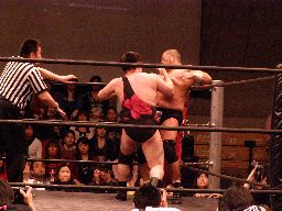 再度ロックアップ、東郷ヘッドロック、フライングメイヤーからグラウンドヘッドロックに(左写真)。アントンはエビ固め、カウント2。