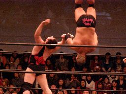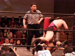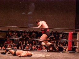 東郷コーナーに振る、アントン切り返す、東郷はコーナーで一回転してエプロンに。別コーナーに上るがアントンはデッドリードライブ(左写真)、カウント2。