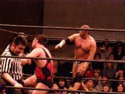 アントンヘッドロック、東郷はアントンを松井レフェリーにぶつける(左写真)。