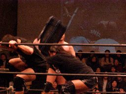 東郷ペディグリー(左写真)、ダイビングセントーンを狙ってコーナーに上るが、入ってきたKooが場外からイスを投げつけ撃墜。