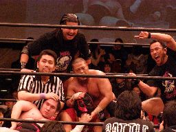 松井レフェリーを加えたメタル・ヴァンパイヤがKooとアントンを捕まえてポーズ(右写真)。