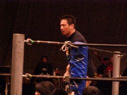 「NO」のポーズを見せる東郷にアントン突っかける、東郷はロープを引っ張ってアントンを場外に落とす(左写真)。東郷イス攻撃、アントンパンチで反撃、ヘッドロックに。東郷は鉄柱にぶつける。そこに大鷲と晴也も参戦、アントンは額から流血。5分経過。
