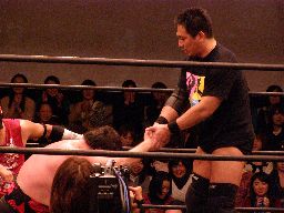 東郷フィストドロップ(左写真)、カウント2。東郷チョーク攻撃、レフェリーがブレーク命じると今度はヒザをノド元に押し付ける。