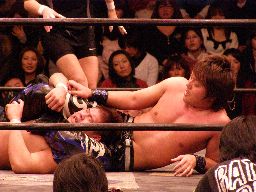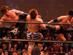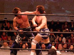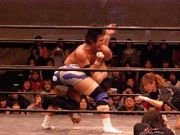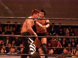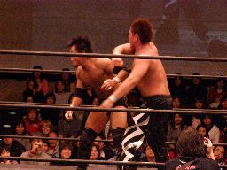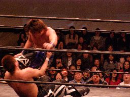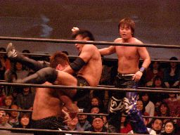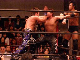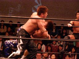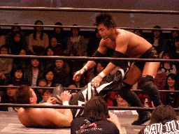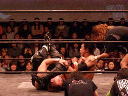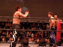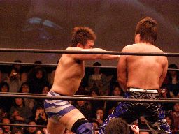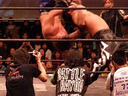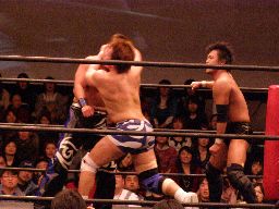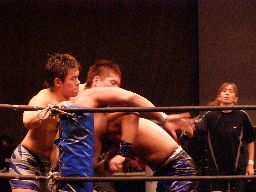 ロックアップ、HARASHIMAそのまま相手コーナーに柿本を押し込む、佐々木が強制タッチ(右写真)。