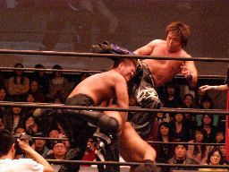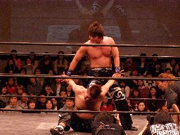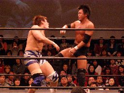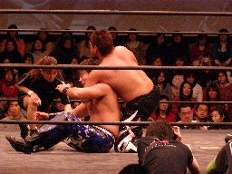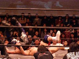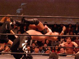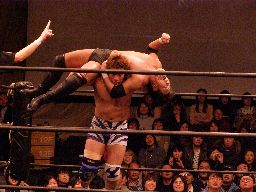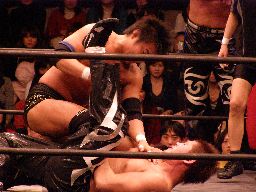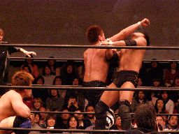 柿本入り佐々木と柿本がダブルのショルダーブロック(右写真)。柿本ボディスラムからカバー、カウント2。