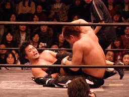 澤張り手、ローキック、タックルは柿本切ってバック取る。澤切り返してがぶる、ロープブレーク。寝っ転がった柿本を澤上から攻める(左写真)。ヘッドロックに取ってフライングメイヤー、柿本ヘッドシザーズで返す。澤コーナーに押し込んで張り手、HARASHIMAにタッチ。