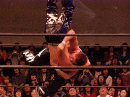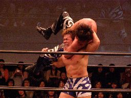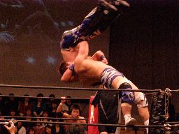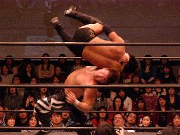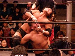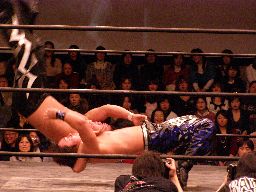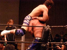 HARASHIMAブレーンバスター、柿本逆に投げようとするがHARASHIMAが強引に投げる(右写真)、カウント2。