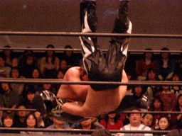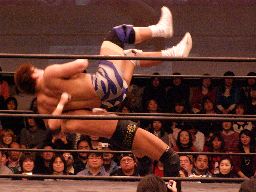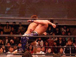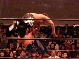 HARASHIMAは佐々木のラリアットをかわしてショルダーネックブリーカーからジャンピングDDT(右写真)、エプロンに出てスワンダイブプレス、カウント2。10分経過。