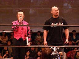 休憩明け、新藤リングアナが3.16「HARDHIT CORE」に参戦する長井満也と一緒に3.16の告知(右写真)。決定分カードは高木三四郎vs竹田誠志、飯伏幸太vs石川修司。追加参戦予定選手として伊橋剛太の名も。