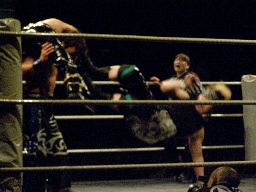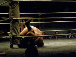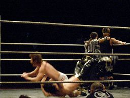 高梨がウラノにトラースキック、ロープに飛ぶがウラノは日韓を楯に高梨をストップさせて延髄蹴り(右写真)。