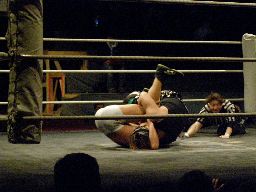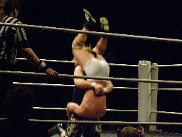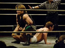ウラノボディスラム2発、カウント2。逆エビ固め(右写真)、リリースしてニースタンプ、カウント2。KUDOにタッチ。