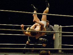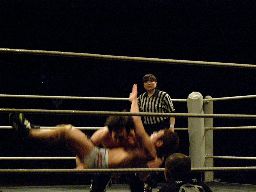 KUDOボディスラム(右写真)から倒立式ダブルニードロップ、カウント2。ウラノにタッチ。