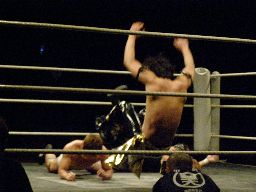 ウラノキャメルクラッチ(左写真)、HARASHIMAがカット。KUDOがHARASHIMAを場外に出す。