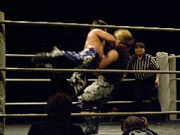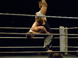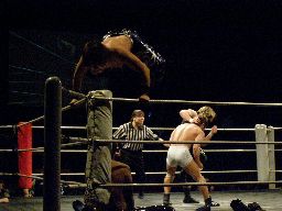 KUDO高梨をコーナーに振る、高梨切り返す、KUDOエプロンに出てスワンダイブミサイルキック(左写真)、カウント2。