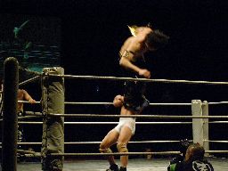 コーナートップからダイビングフットスタンプ(左写真)、カウント2。