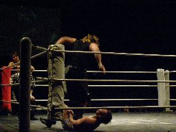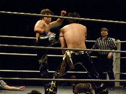 KUDOロープに振る、高梨ランニングエルボー(左写真)、ついにHARASHIMAにタッチするがウラノが李日韓レフェリーの注意を引いていて日韓見てない。