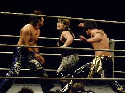 KUDOとウラノが突っかけて試合開始(左写真)。KUDOはHARASHIMAを場外に出してプランチャ。