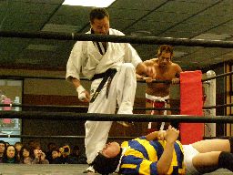 マイケル入ってサッカーボールキック(左写真)。相手は最後まで見たほうがいいと思うぞ・・・。ストンピングの連打で場外に落とす。マイケルパンチ、鉄柱攻撃。リングに戻してカバー、カウント2。ボディスラムで投げて小笠原にタッチ。
