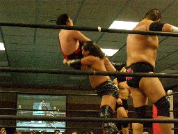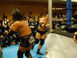 大鷲入って両足で踏む。アントンが立ち上がると腕パンチ(右写真)、コーナーに詰めて逆水平2発。コーナースプラッシュ、対角線コーナーに振るがアントン途中で倒れる。大鷲ギロチンドロップ。