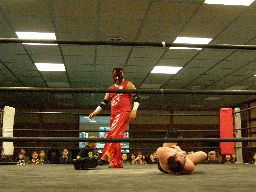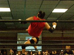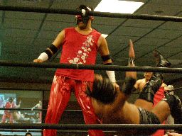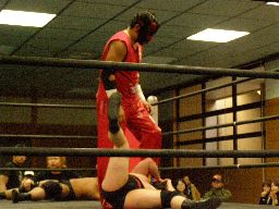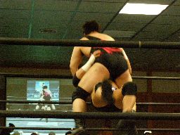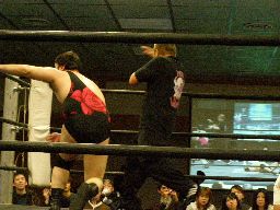 メタル・ヴァンパイヤがリングイン、レフェリー不在のため松井がレフェリーを買って出る。試合開始、東郷がアントンを場外に落とす(左写真)。