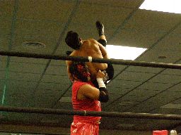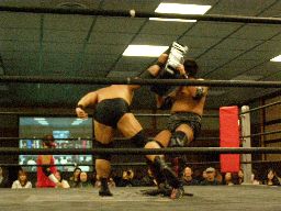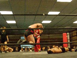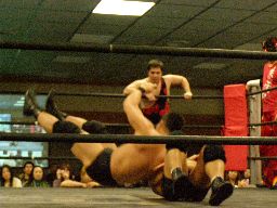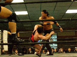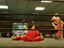 高木ロープに振ってドロップキック、ボディスラムからエルボードロップ(右写真)、カバーに入るが松井は靴紐が解けたためカウント取れない。高木はアントンにタッチ。